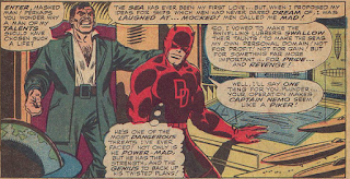 Preceding the Ka-Zar kaper in our prior post by about two years, this “landmark issue! In which Daredevil attains the towering heights of greatness he was born to achieve!...introduc[es] the matchless artistic wizardry of Marvel’s newest, and most eagerly-awaited, illustrator…the inimitable John Romita!” (building on a foundation of Kirby layouts); take that, slacker Wood! Although brief, Jazzy Johnny’s stint on DD included the “backdoor pilot” for his defining run on Amazing Spider-Man, Spidey’s guest-shot in the #16-17 two-parter. Believing that “Without me they’ll be free to follow their hearts!,” DD swings across town to board the S.S. Odyssey in the nick of time for a “cruise to the other side of the world”—but it’s been targeted by the Plunderer.