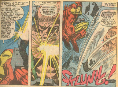 PE: I know it's Iron Man's book and El Presidente has a jones to destroy some American symbol but why Shellhead? Even our hero seems befuddled. I.M. fought a lot of commies in his day so maybe it's just a matter of the chickens coming home to roost. Just one of several questions that remain unanswered at the end of this one-shot story. For instance, the attack at the climax must last no more than a few minutes but Iron Man feels compelled to kill The Crusher rather than subdue him. Wonky thinking on his part when he says "Normally, I'd be reluctant to do this to you... but you've left me no choice! You attacked without cause... on a mission of murder... and your own power is your undoing! Because of that power, I dare not take any chances with you!" Using that logic, he should have offed every other foe he's faced, especially world-threateners such as The Mandarin. And what exactly is The Crusher's fate? I.M. exclaims that his ray has made the villain too heavy for the surface of the earth (SKLUNG!) but what exactly does that mean? Does he sink into the ground and just keep sinking right down through Mole Man and Tyrannus country and into the earth's core? I need to know! Thank goodness Stark had just perfected his Grow Your Own Bulk Gizmo as that was the only weapon on earth that could stop The Crusher.