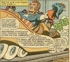 MB: Okay, we’re in trouble right from the splash page: I always said the Master Planner was a totally forgettable alias for Dr. Octopus in Amazing Spider-Man #31-33. Roy seems to have proven my point by using the same dull moniker for this dude; as rendered by Jack Sparling (who he?)—even with inks by Joe Sinnott that are uncredited in myMarvel Double Feature reprint—he resembles nothing so much as a large, demented leprechaun. Why is the public not a wee bit suspicious of this ersatz Cap who appears sans trademark shield, wielding an unfamiliar weapon, and acting totally out of character? Who bankrolls his garishly garbed goons, “sub-car,” and proton beam? Where does he get the technology? And, most important, who cares?