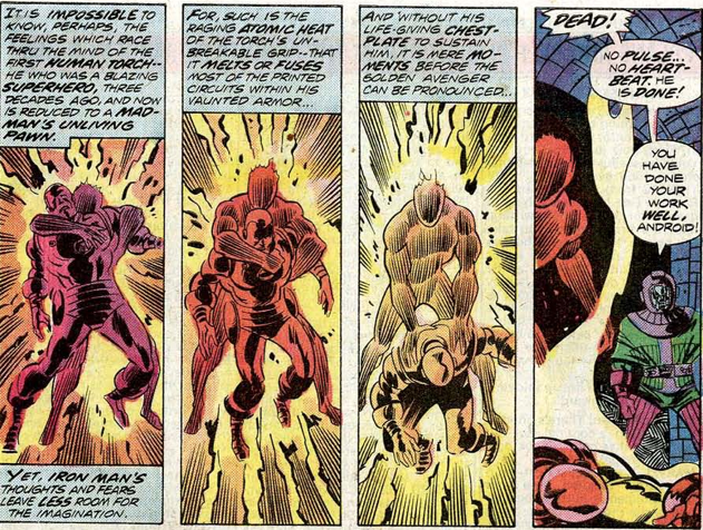 Scott: The art takes a huge step backward here. Dave Cockrum has his fans, but I’m not one of them, sadly. This story churns on and on, with Iron Man pronounced dead and, naturally, revived by the end. The only real progress anywhere is the revelation that the Vision is actually the original Human Torch android. Otherwise, this seemingly endless issue only taxes the patience.