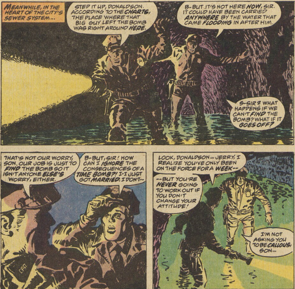Dracula having to feed is the one brief diversion from the pell-mell plot. I hold it up, class, as an example of Wolfman's unmatched gift for instant, intense characterization, here concerning Emily Arthurs, night school instructor at Boston College, about to be sexually assaulted after class before Drac comes to her - alas, temporary, pre-vein opening - rescue. Finishing his meal, Dracula instructs the expiring Ms. Arthurs to return to class a week later, and bestow her own bloody kiss upon her would-be rapist. It's a compelling slice of life (and death), served up in less than two pages. Masterful.