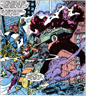 Chris: Well, I guess it is possible for me to keep an open mind -- I'm enjoying these first two chapters of the Tunnelworld adventure. Of course, this installment is mostly action, with virtually no development of the Arisen Tyrk/Lunatik business (and barely any annoying banter from them). We're no closer to understanding why Dr Strange is so worried about drawing the attention of the Nameless One; but, after all the exposition of #71, for me to complain would be needlessly mean. Despite the bizarre surroundings, Nighthawk quietly takes command -- even though that's been Doc's role, and the setting is more Doc's element -- so bully for you, Kyle.