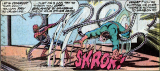 Fave sound effect is the painful "SKROK!" on page 23, as Doc Ock's tentacles hit the floor when Spidey busts out of a nasty hold, followed by one of the aforementioned tentacles being ripped off. Ouch!