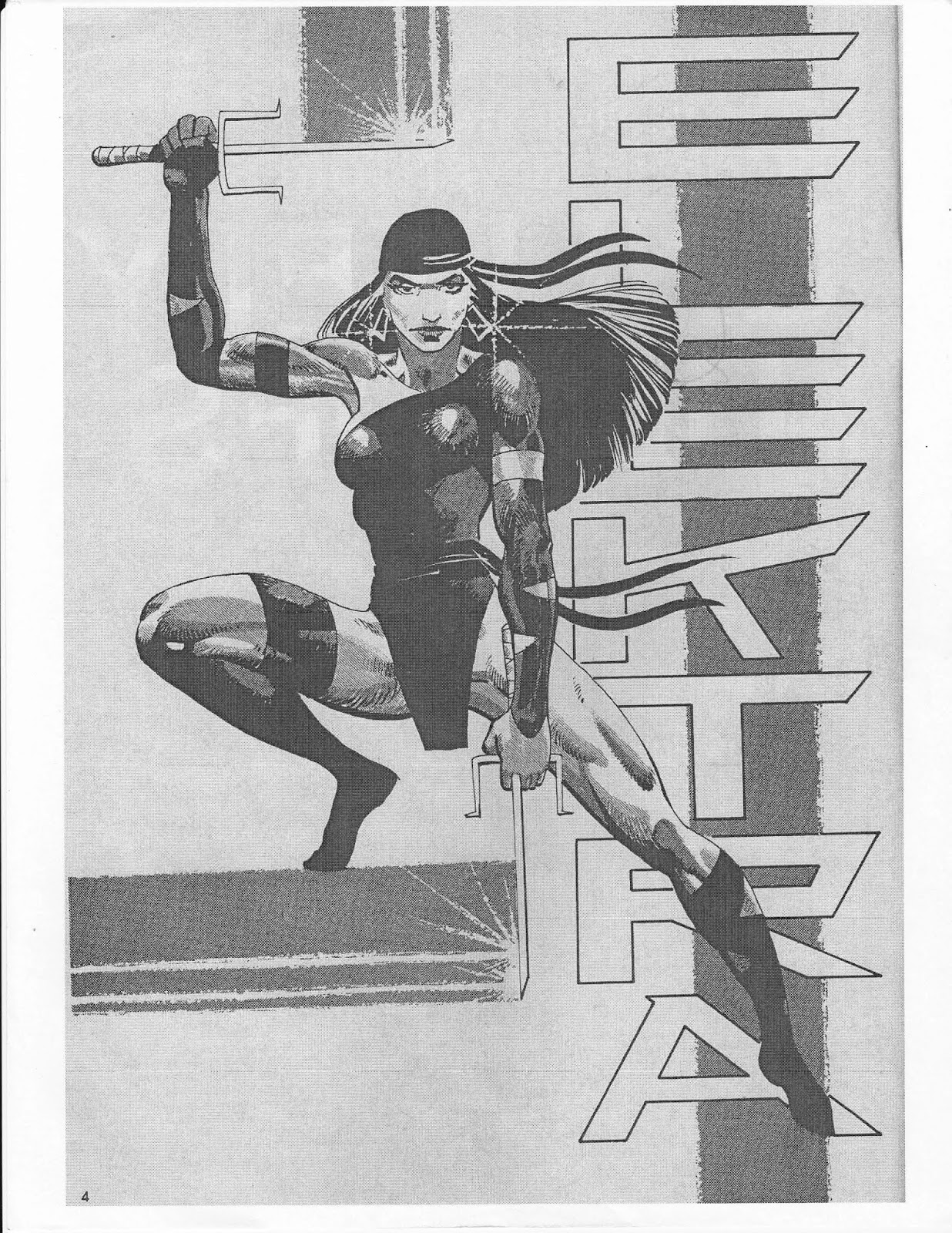 #28. At this point in Daredevil, Frank was only providing breakdowns for Klaus Janson. But for the 10-page “The Mongoose Gambit” — often referred to as simply “Elektra” — he provided full pencils and inked his own work. It’s hard to exactly call Miller a great artist: he’s sloppy, his characters use stilted poses, facial features are not well defined, and detailed backgrounds are rarely attempted. However, he’s a master of mood and shadows as well as quick and deadly violence. And he’s at the top of his game here. Surprisingly, there are a few close-ups of Ms. Natchios and she actually looks quite beautiful. Not something I would expect for an illustrator who revels in the grotesque. She looks a bit like a transvestite in the pin-up below though. From what I’ve read, this story is supposed to take place before Elektra first entered Matt Murdock’s troubled life.