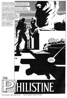 Um, yeah. I know that RenĂ© Descartes was all “I think, therefore I am” and Nietzsche had a beef with organized religion, but don’t ask me what branch of philosophy Denny O’Neil and Frank Miller were aping with “The Philistine.” It’s basically eight pages of the curator pontificating about art while his rhetoric comes alive in real time. “You must permit art to assault you” and, BAM, a swordfight breaks out. “Art can be seductive as well as fierce” and, POW, naked succubi appear. “Art will ever be victorious” and, WHAM, the suit of amour strikes. What’s the point? I can’t imagine that O’Neil and Miller are anti-art. Is it about art snobbery? Maybe I’m just missing something obvious.