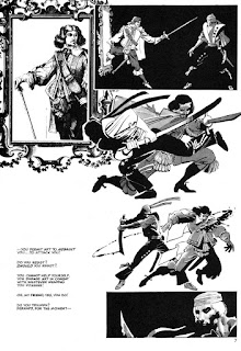 In 1982, Miller was still only providing breakdowns for Klaus Janson on Daredevil, but, like “The Mongoose Gambit,” he goes whole hog here. There’s a very effective — and prodigious — use of black, which makes up most of the backgrounds. Other panels are simply battling figures against the white of the paper. Miller doesn’t use the entire frame on many pages, leaving a lot of areas empty, though sometimes those spaces are used for the curator’s dialogue. He also experiments with washes and Zip-a-Tone, adding welcomed shades of grey and texture. I’ve said before that I thought that Frank got lazier — though some might say more stylized — as time went on, but he puts a great deal of effort into the paintings and other objects d’art. They are far from photo-realistic, but have that feeling. Maybe it’s just because their fine details stand out against the simple strokes of the characters. Now I’m guessing that’s supposed to be the work of Rembrandt and Michelangelo on display, but don’t make me swear on it. The swordsman has a nice design, kind of like a samurai El Topo.