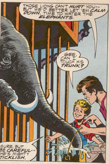 Bruce wanders down to the site and secures a job from Mr. Torrance who needs help to get the roller coaster in shape for tonight’s crowds. After finding new clothes in a tent — and meeting the surly strongman Bruno and the kindly clown Coco — Banner gets to work, earning enough money to treat Todd to a grand time of fun and food. But when Torrance spots the kid he erupts: only Bruce’s intervention stops the boy from being beaten again. As Todd runs off, Banner stumbles away, feeling his gamma-radiated transformation coming on. The Hulk rampages through the circus, smacking Bruno and battling lions. When the carnival owner trains a gun on Jade Jaws, Todd rushes back and puts his body in harm’s way. Hulk cradles the boy and leaps away taking him back home. After the green goliath leaves unnoticed, Todd is grounded by his furious father for attending the carnival with Banner, “a stranger” — he also threatens to send him away.